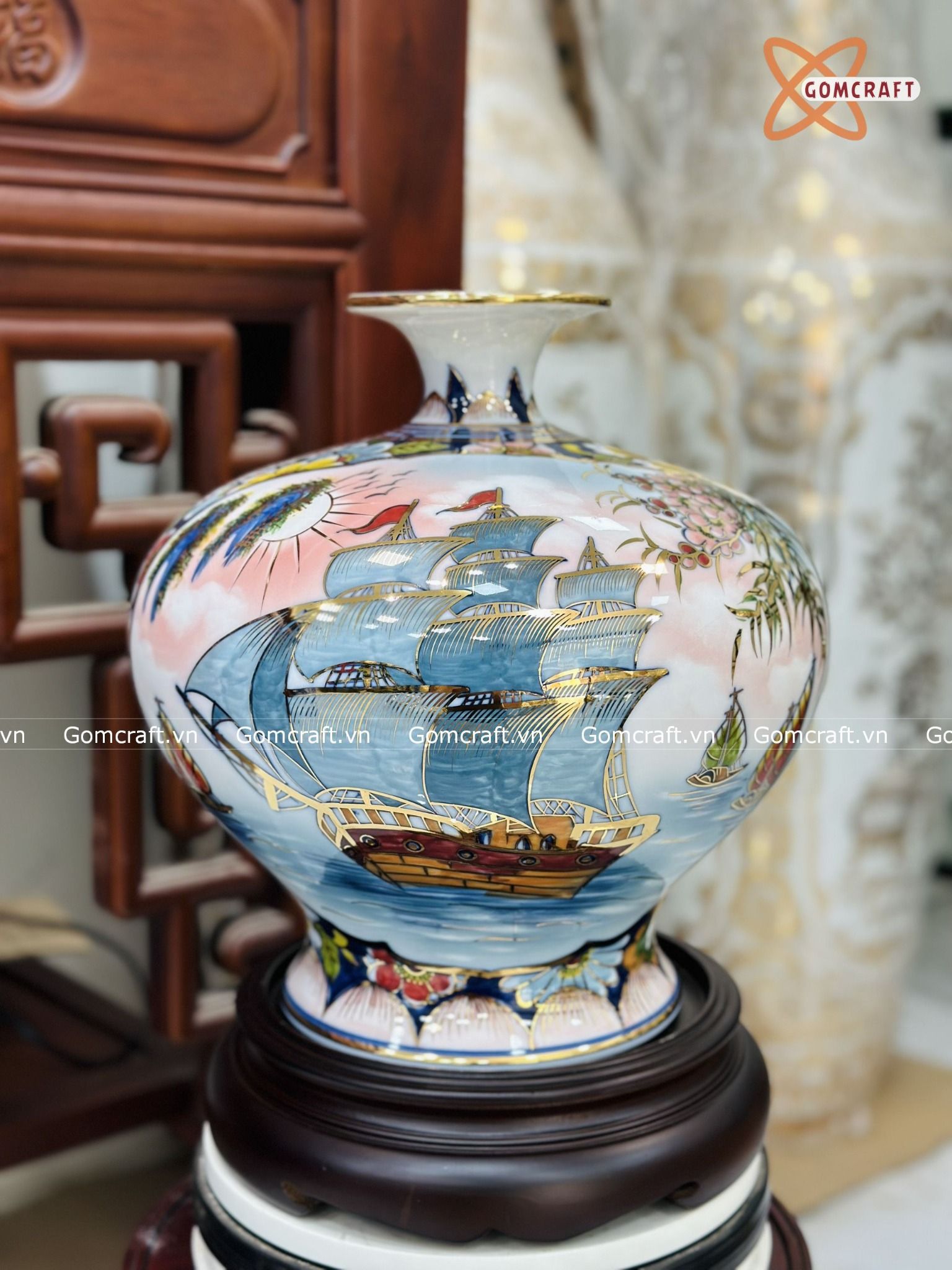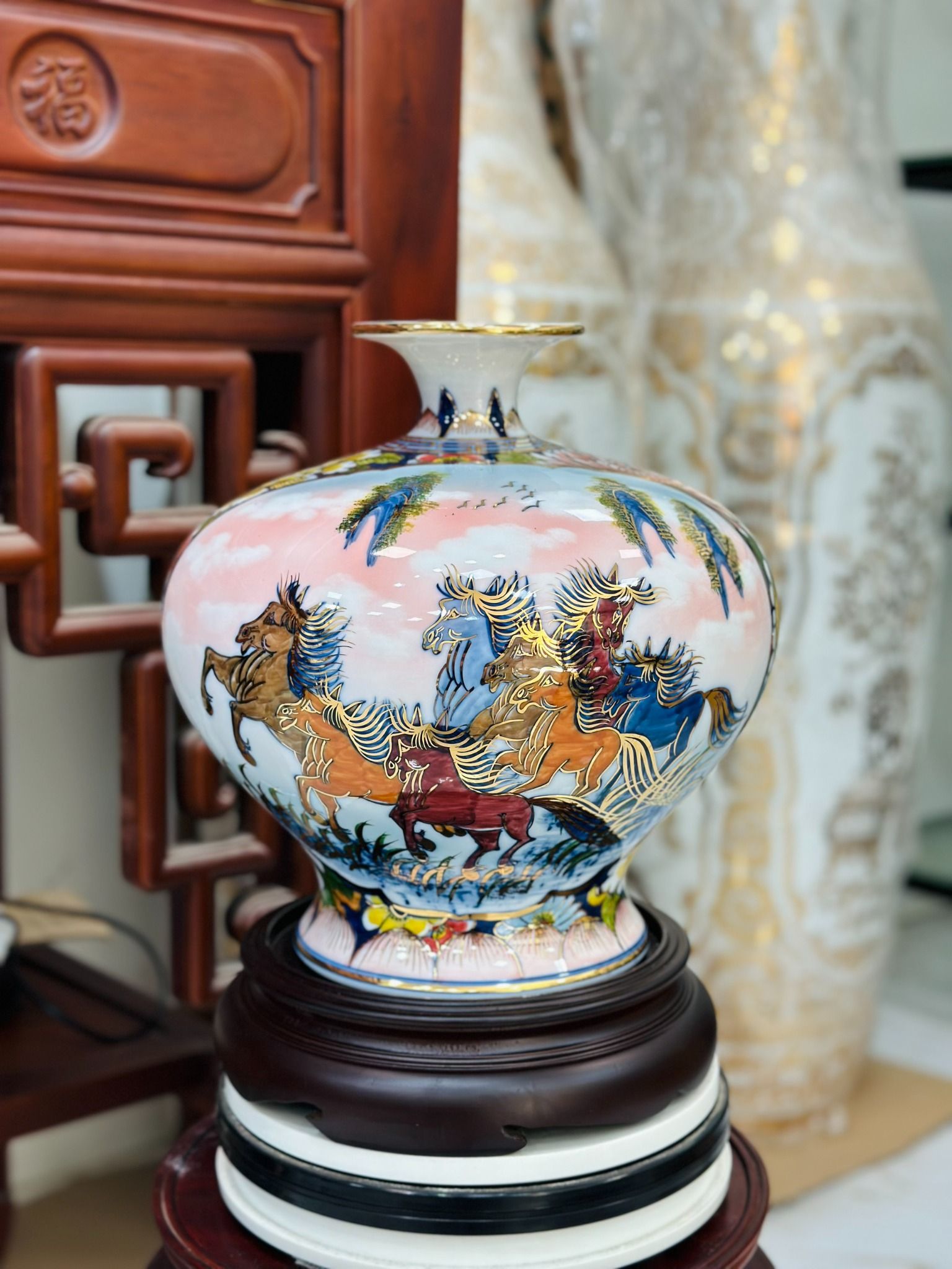 Quà Tặng Khai Trương bình hút lộc Bát Tràng | Bình Hút Lộc men màu vân mây vẽ vàng Thuận Buồm Xuôi Gió Mã Đáo Thành Công Tài Lộc cao 30cm phình 32cm