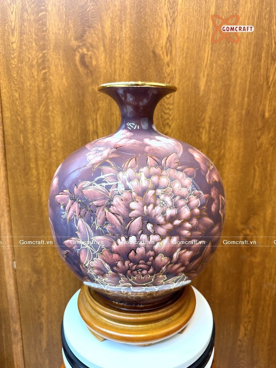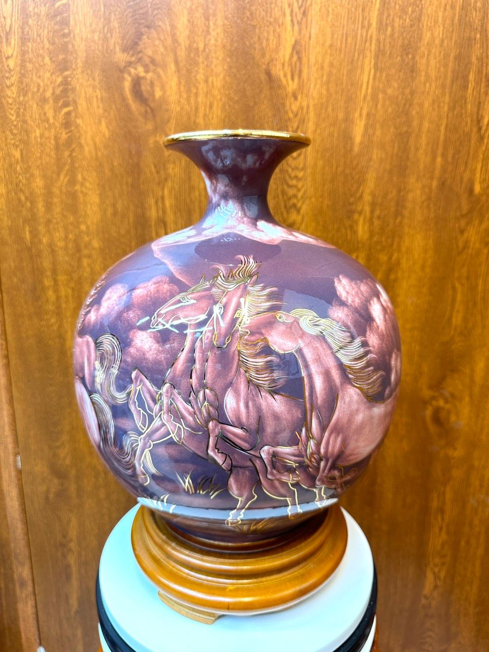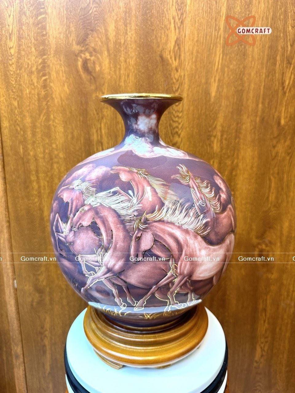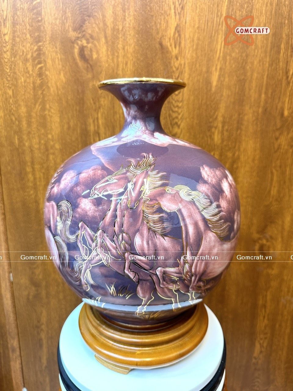 Quà Tặng Khai Trương Bình hút lộc Bát Tràng nền tím vẽ vàng Mã Đáo Thành Công cao 30cm bụng 28cm