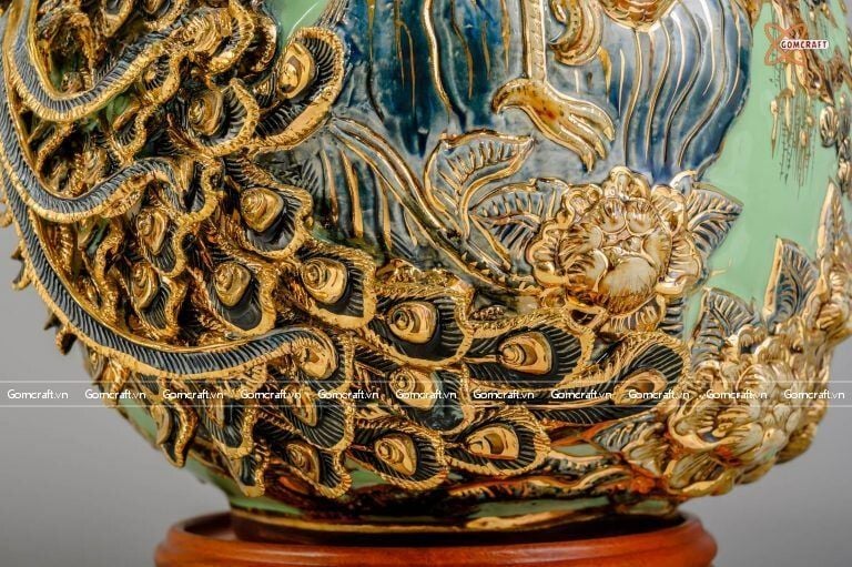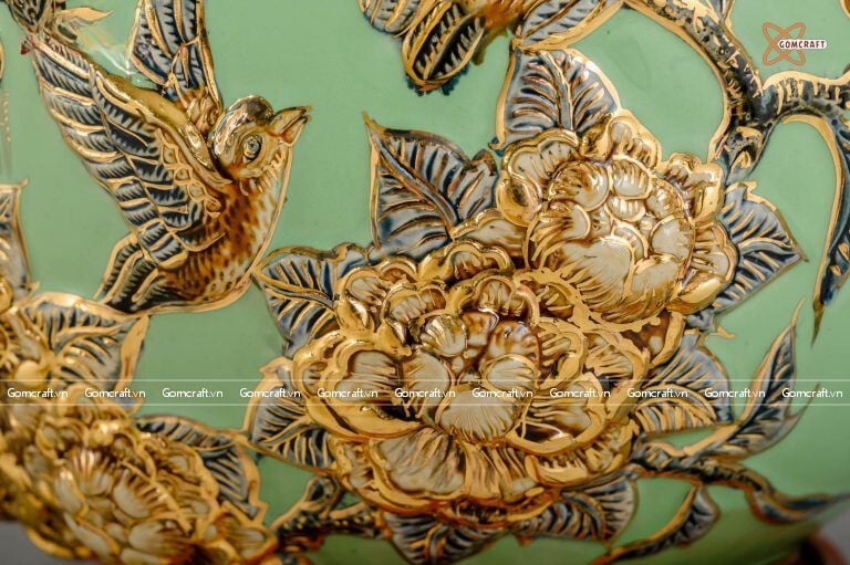 - Họa tiết tinh tế độc đáo: Bình Hút Lộc được trang trí với nhiều họa tiết hoa văn mang ý nghĩa tốt lành, như Hoa Mai, Hoa Đào, Hoa Sen, Hoa Mẫu Đơn, Chim Công, Rồng Phụng, Bát Mã, Bát Bảo v.v.. Một số bình hút lộc còn được dát vàng 24K hoặc vẽ vàng 24K để tăng thêm vẻ sang trọng và quý phái.