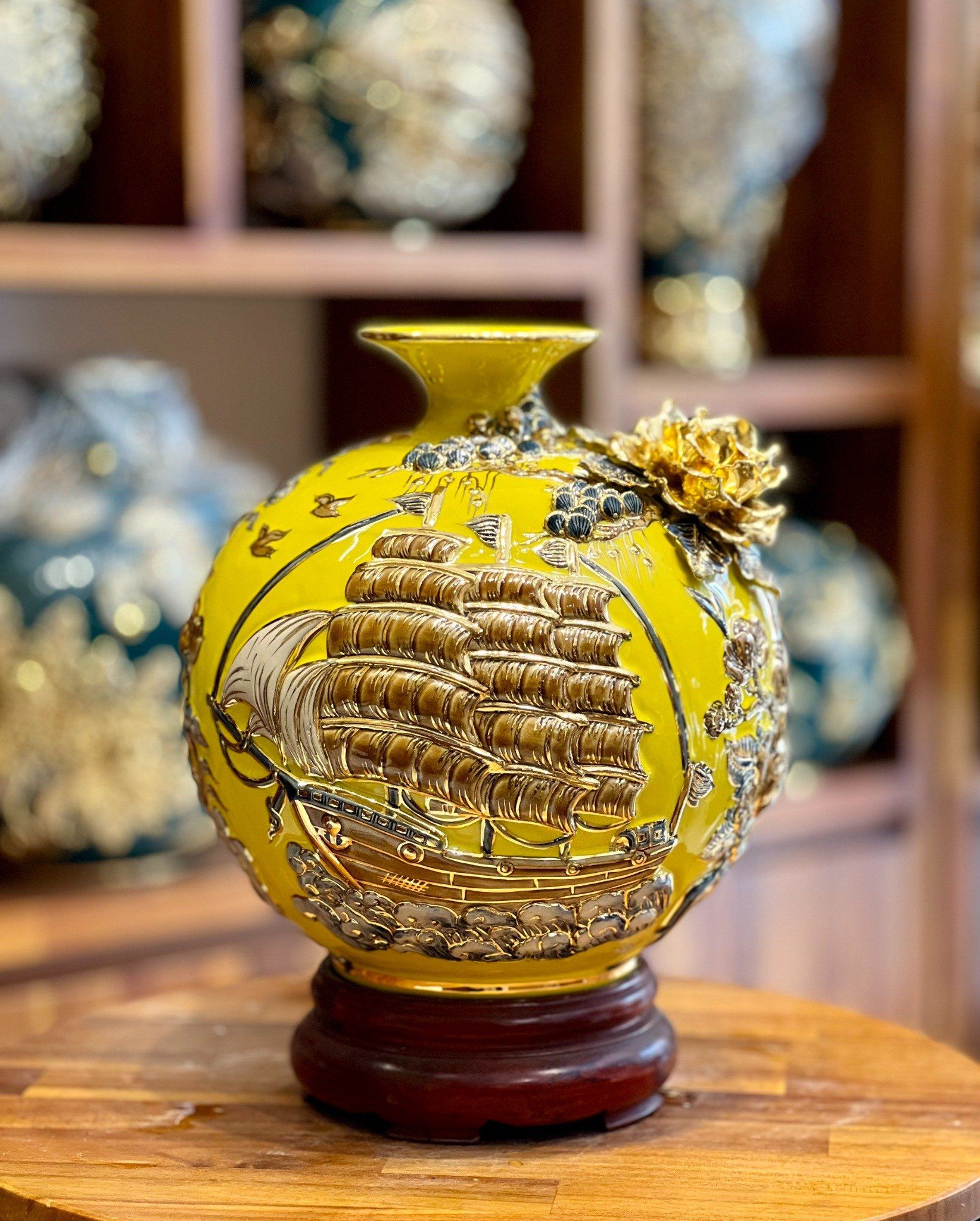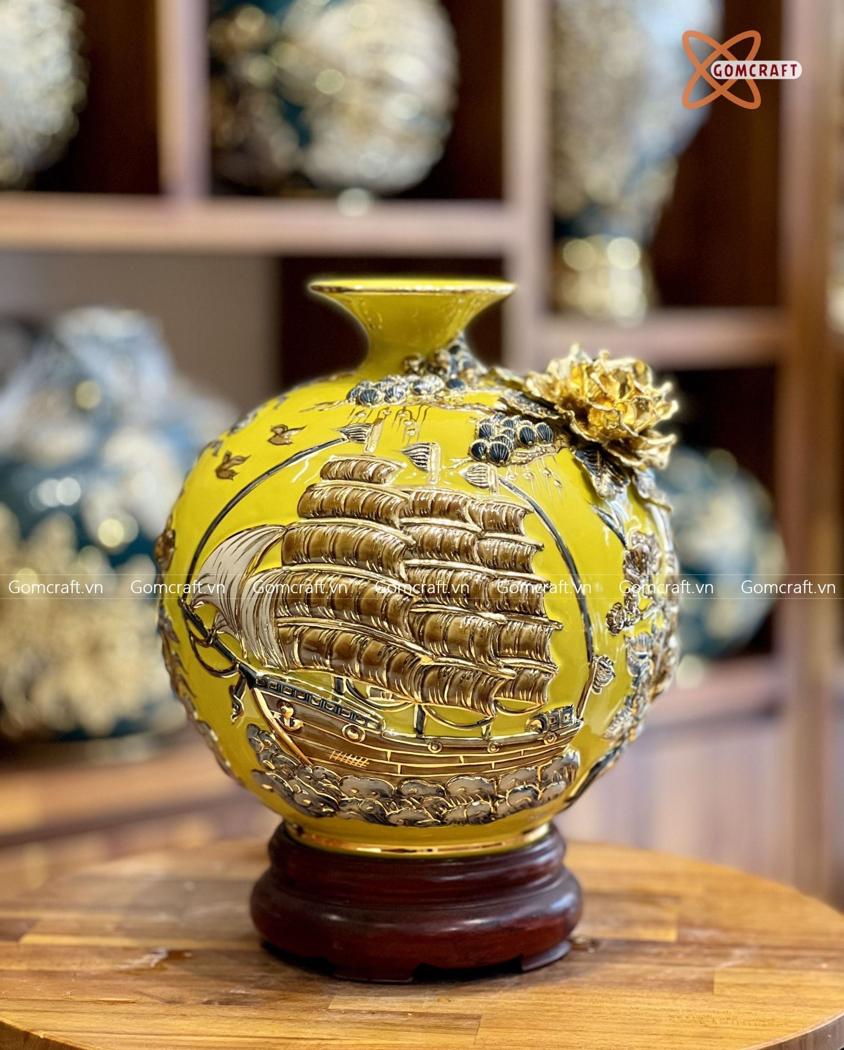 Quà Tặng Khai Trương Bình hút lộc Thuận buồm xuôi gió nền vàng vẽ vàng đắp nổi kênh hoa cao 26cm