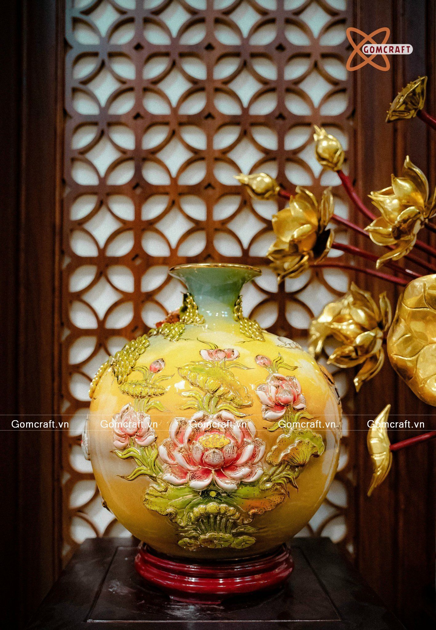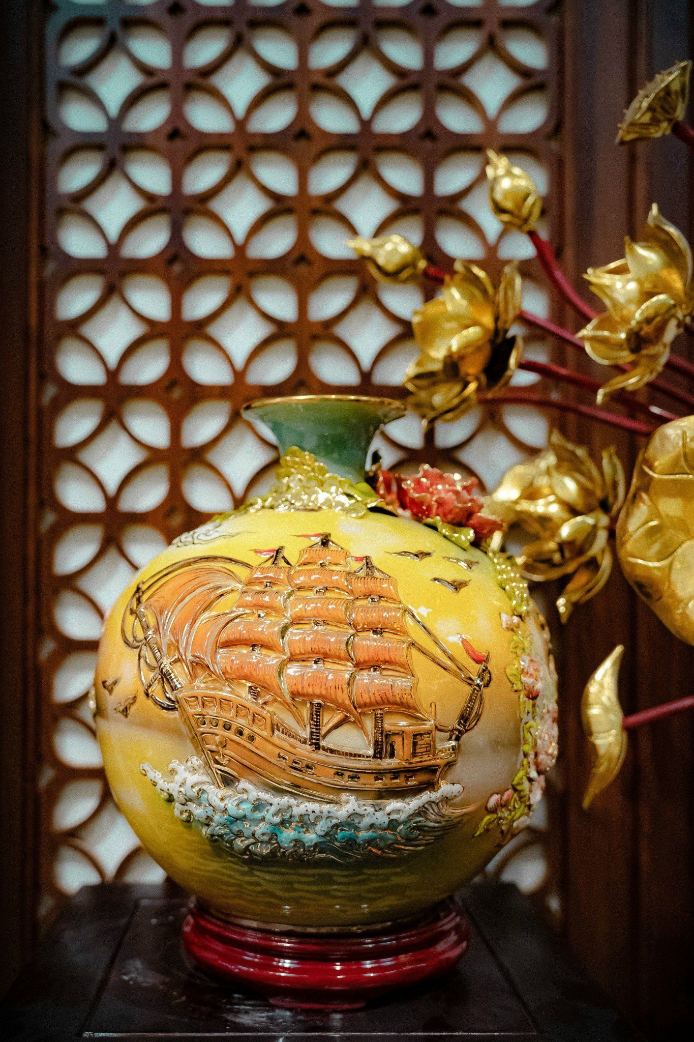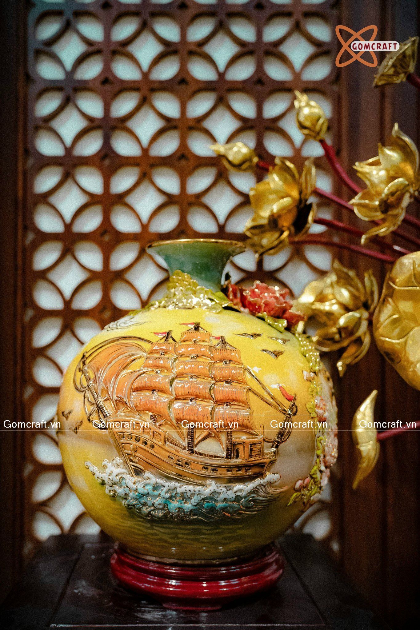 Quà Tặng Khai Trương Bình hút lộc Thuận Buồm Xuôi Gió vẽ vàng nền vàng loang đắp nổi kênh bong cao 32cm