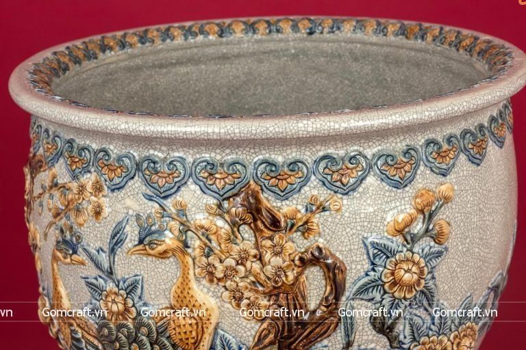 - Họa tiết tinh tế độc đáo: Thống sứ được trang trí với nhiều họa tiết hoa văn mang ý nghĩa tốt lành, như hoa mai, hoa đào, hoa sen, hoa mẫu đơn, chim công, rồng phụng, bát mã, bát bảo, v.v.. Một số thống sứ còn được dát vàng 24K hoặc vẽ vàng 24K để tăng thêm vẻ sang trọng và quý phái.