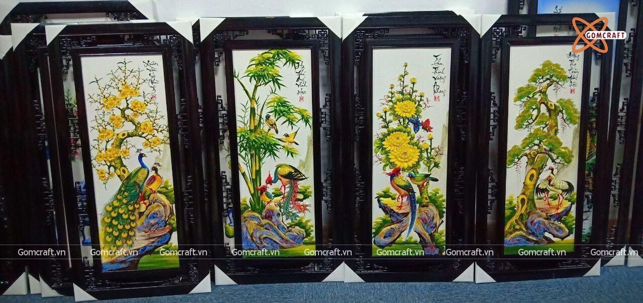 Tranh Gốm Tứ Quý Bát Tràng men màu vẽ tứ cảnh kích thước 50 x 100 cm khung gỗ thông