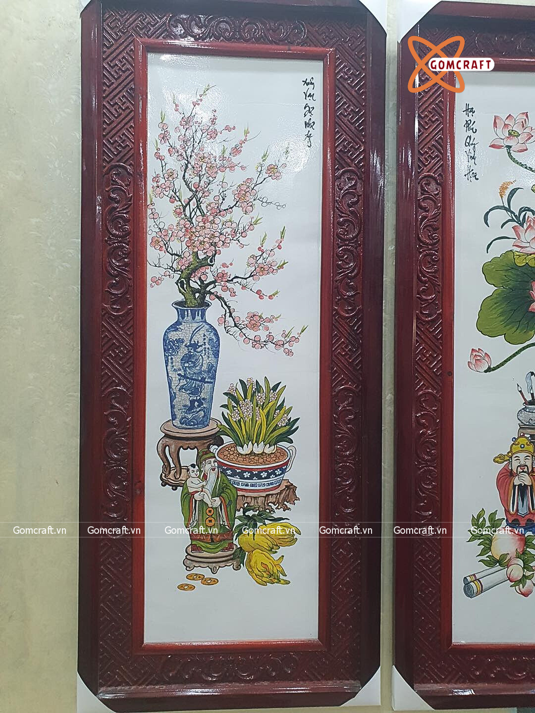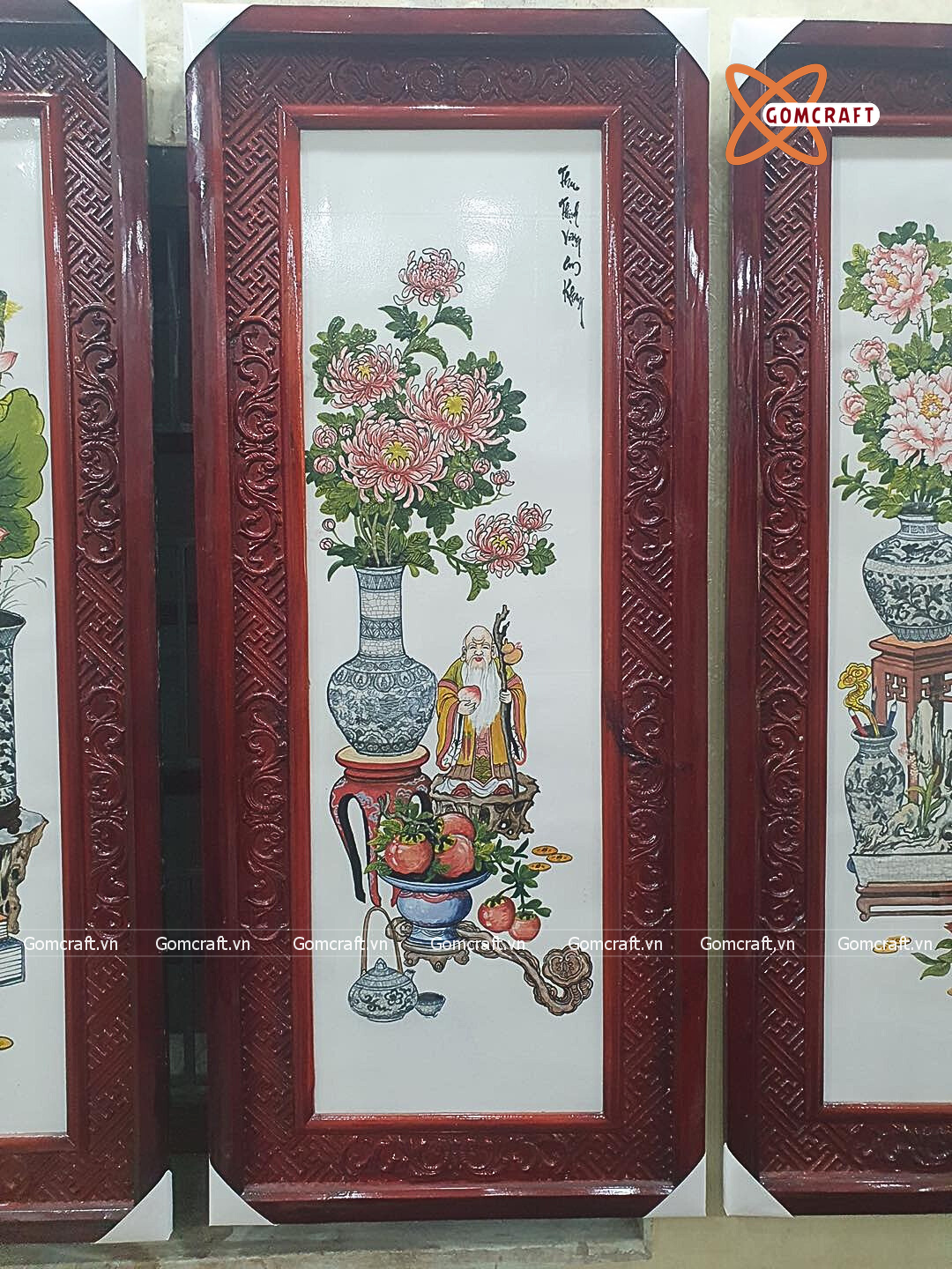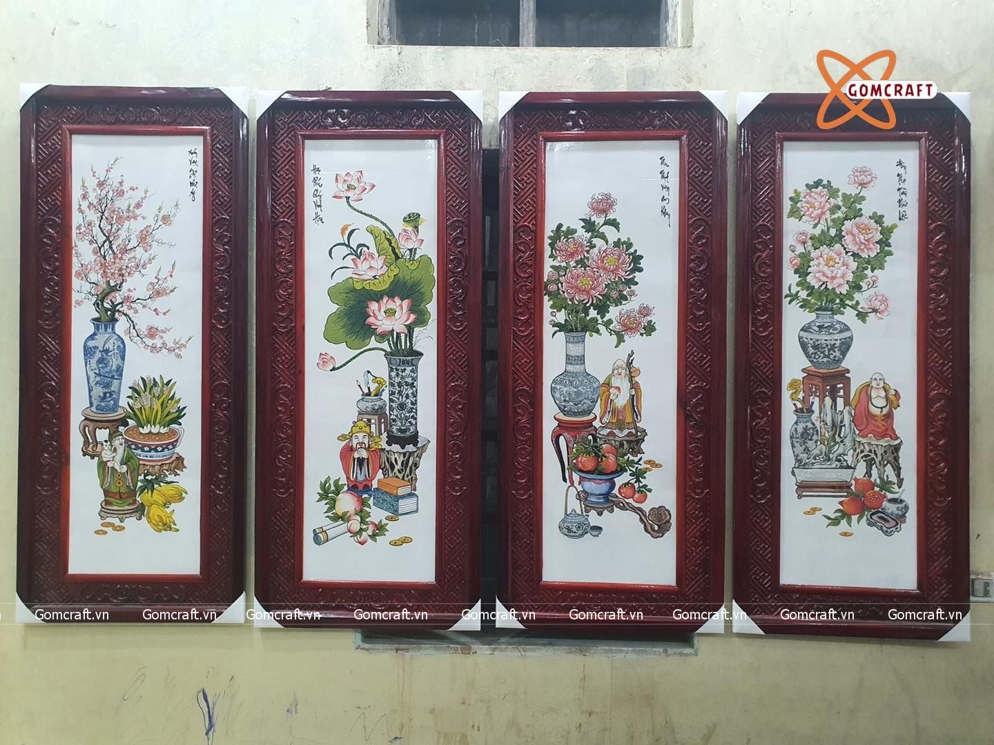 Tranh Gốm Tứ Quý Bát Tràng vẽ cổ đồ men màu kích thước 45 x 95 cm khung gỗ hương